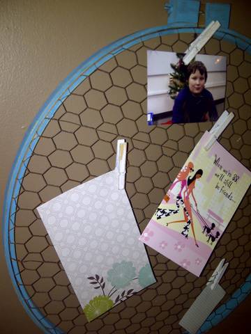 So I made another memo/picture hanger tonight. This one I did different. Remember that chicken wire I bought a couple weeks ago? Well I decided to try use that for this one. I've never used chicken wire before and I now have many battle wounds from it. This one took a little longer but still not to hard and I painted this one turquoise and then sanded it down. I liked the other one but I really like this one.